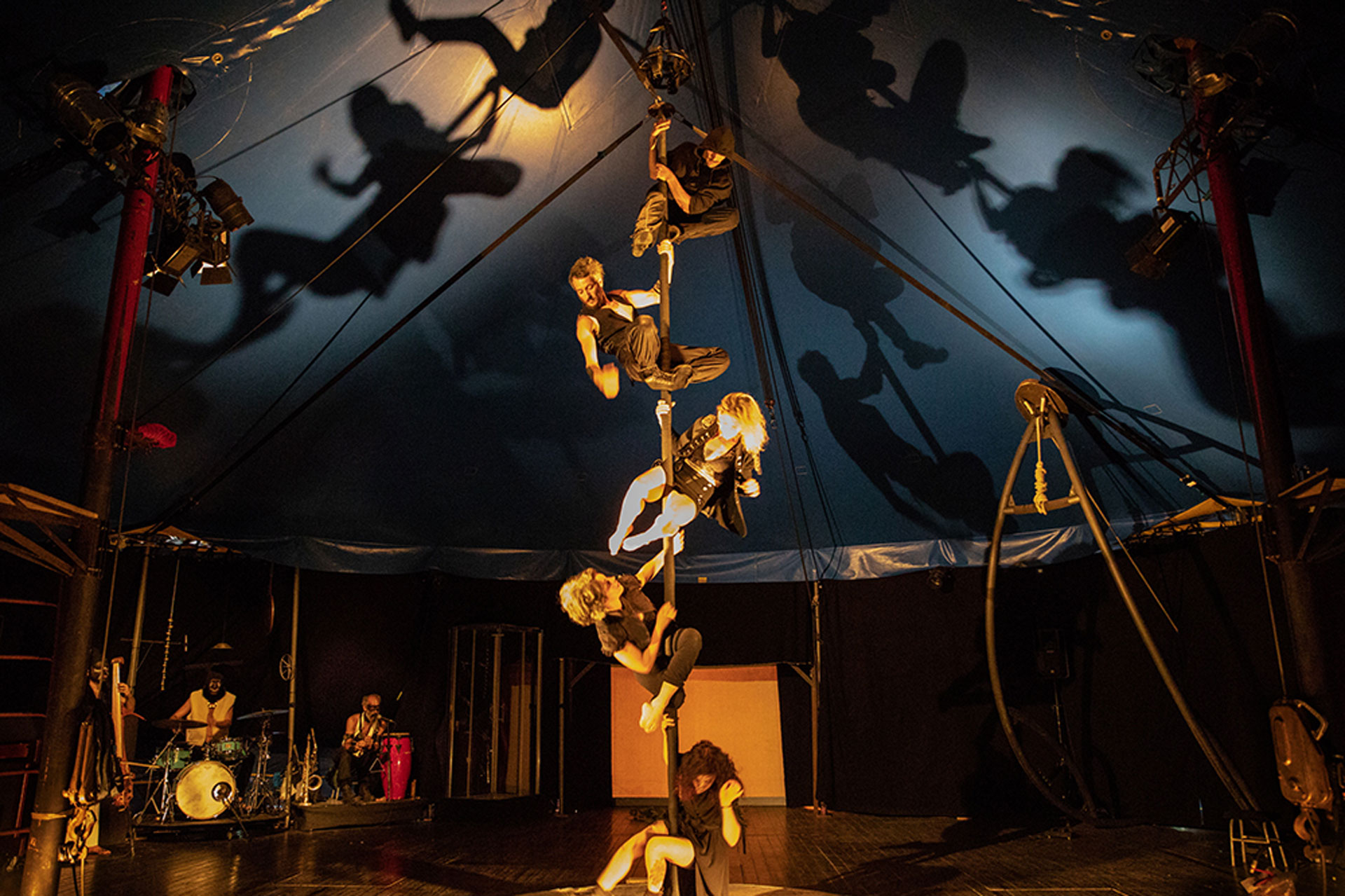 La musique “live”, qui est l’une des marques de fabrique du Circo Paniko depuis ses débuts, accompagne le spectacle et produit une énergie collective, festive et engagée. Les musiciens entrent et sortent de la scène, se mêlant aux acteurs, acrobates et performeurs, peignant pour chaque scène un paysage sonore unique.