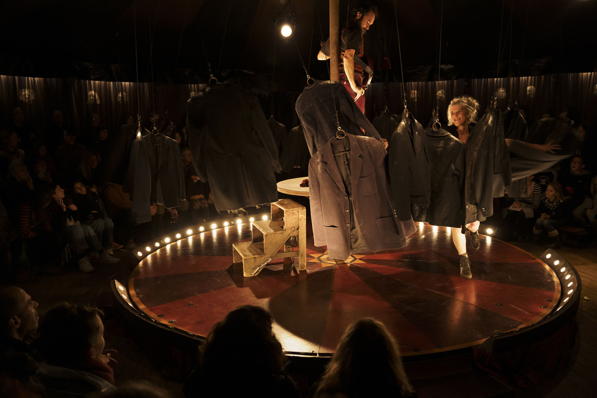 Déclinant un univers esthétique dans une scénographie circulaire, chaque représentation se déroule au plus près des spectateurs, puisque, dans ce chapiteau intimiste de 160 places, le dernier rang ne se trouve qu’à 2,50 mètres de la piste ! « C’est un opéra ambulant, très précieux. La petitesse du lieu crée proximité et intimité entre les spectateurs et nous. Ça nous pousse à travailler d’une manière très sensible ».